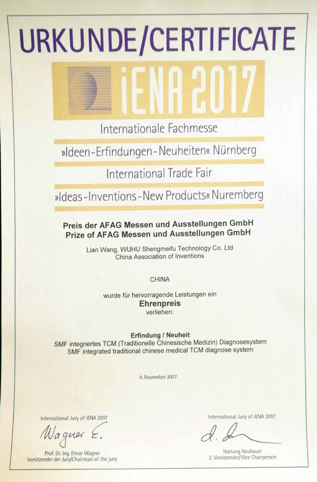 公司于2011年获得国家科技部颁发的中小型科技创新基金;同年5月荣获产品注册证,填补了国内中医诊断设备的空白。