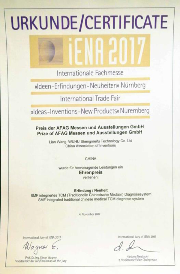 此次获奖是公司继荣获科技部创新基金、国家高新技术企业、中医诊断行业标准制定方、验证方、首批入选“治未病服务适宜设备”、CE认证等多项荣誉之后取得的国际性发明大奖,是我公司科研实力、综合实力不断提升的重要标志。
