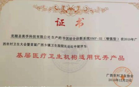 在此次大会上,芜湖圣美孚科技有限公司生产的中医综合诊断系统SMF-Ⅲ(增强型)在2019年广西农村卫生大会暨首届广西乡镇卫生院院长论坛中被评为“基层医疗卫生机构适用产品”。