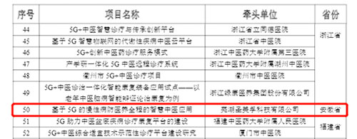 8月17日,中华人民共和国工业和信息化部官方网站发布了“5G+医疗健康应用试点项目名单”,由芜湖圣美孚科技有限公司牵头,联合芜湖市中医医院、芜湖市高科电子有限公司、安徽中医药高等专科学校、中国电信股份有限公司芜湖分公司、天津理工大学五家单位共同申报的《基于5G的慢性病防医养全程的智慧中医应用》项目成功入选此次应用试点项目名单,也是安徽省入选“5G+中医诊疗”方向名单的项目。